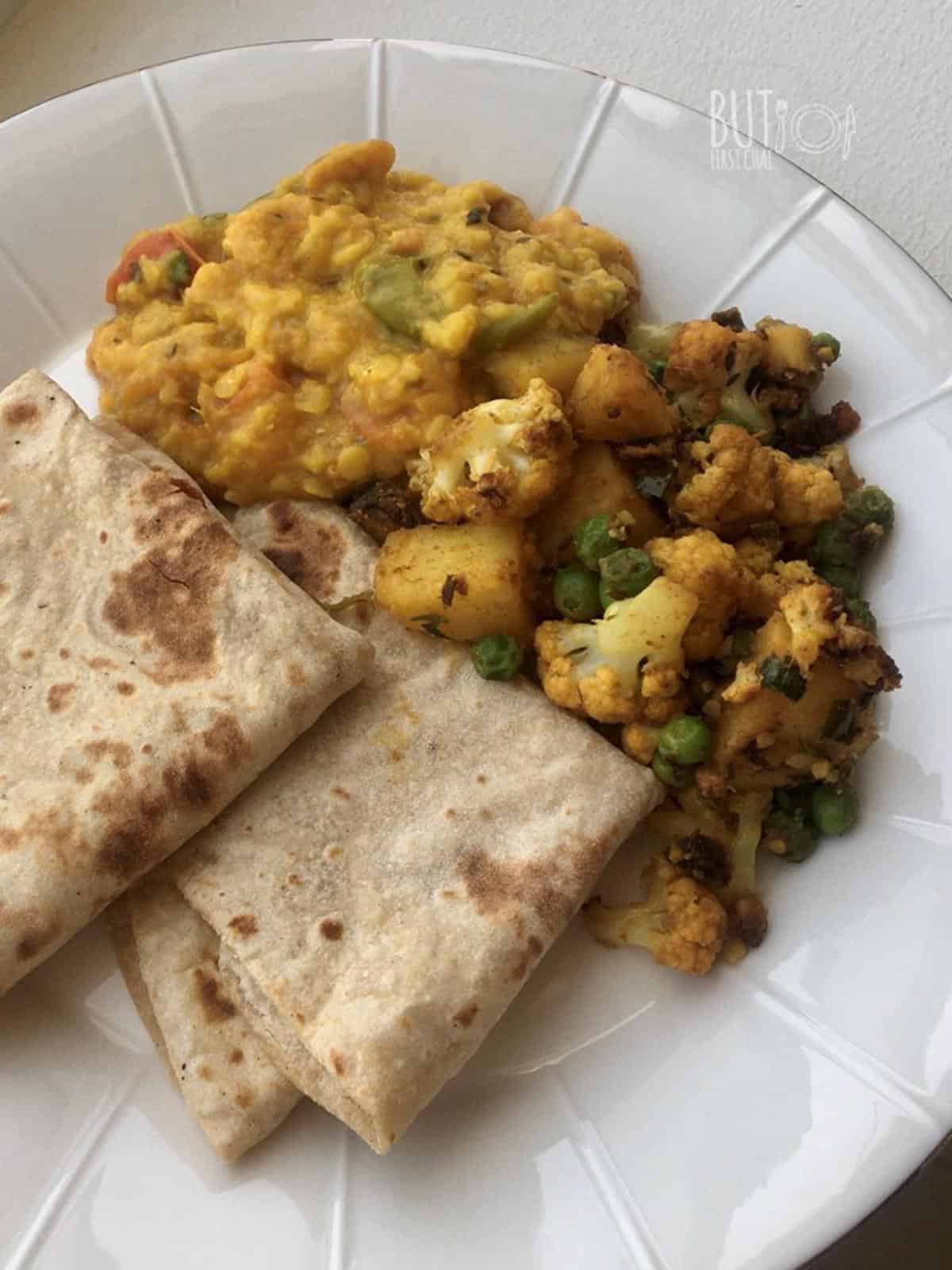 I did not grow up eating Aloo Gobi Matar as it is traditionally a North Indian cuisine. I am a South Indian who loves her idli sambar vada and yet I hardly make them. 😐 Shame.