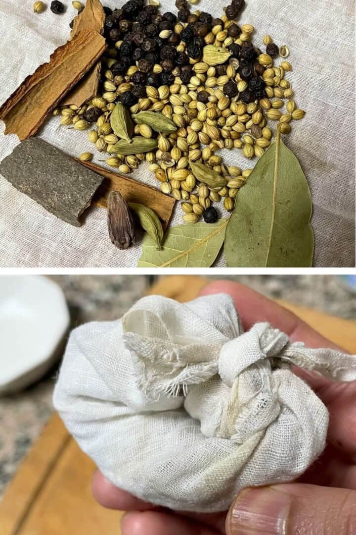 Wrap all the whole spices (listed in the recipe card) in a small piece of muslin and tie it into a tight pouch. This keeps the spices contained and easy to remove later.