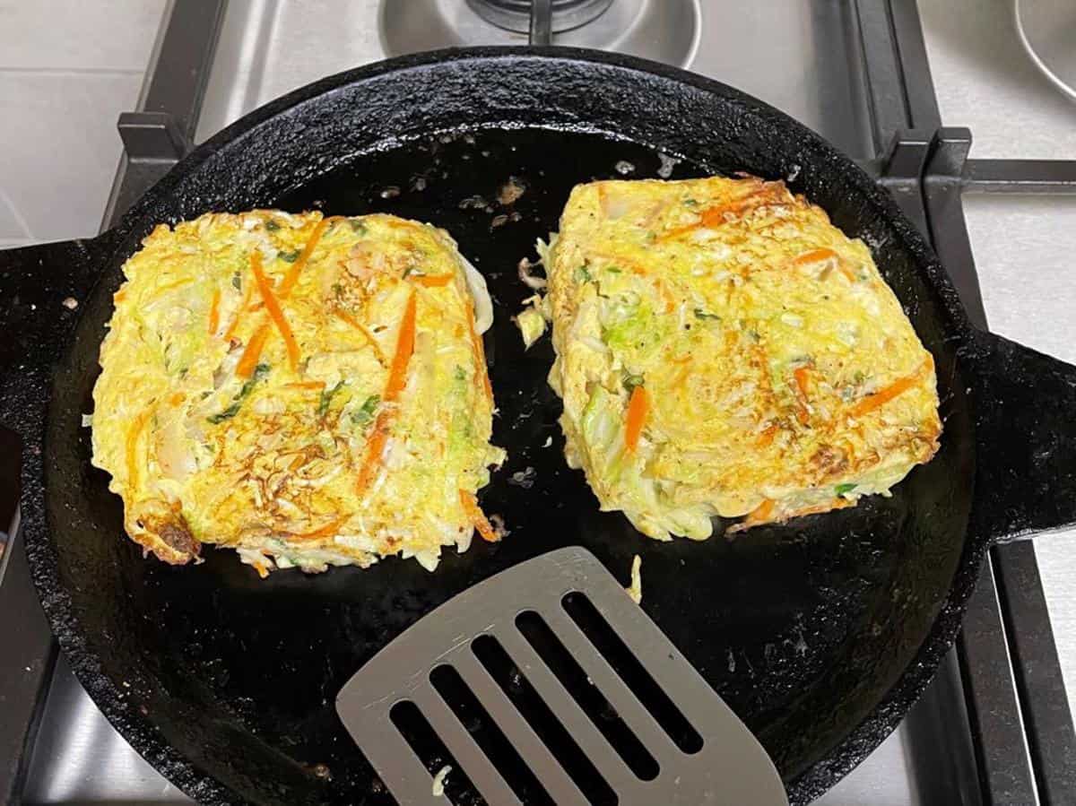 It may seem easy, but if you don't follow the instructions, you will have a hard time getting the cabbage-egg mix to shape up. The secret lies in the way you chop the veggies and the type of spatula you use to turn them.